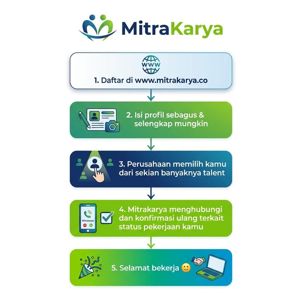 Melalui sistem MitraKarya, efisiensi adalah kunci. Di platform kami, Anda tidak perlu lagi capek-capek mencari kerja. Biarkan Pengusaha yang menemukan dan memilih anda secara langsung.
